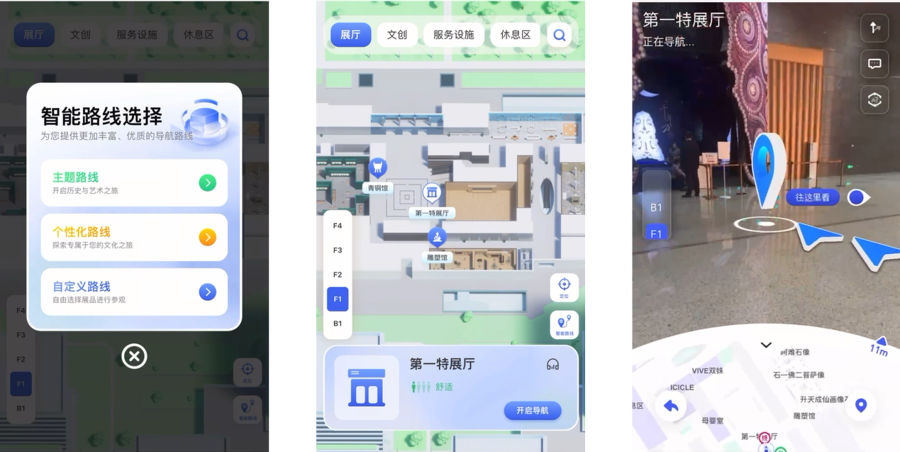 依托厘米级视觉定位与三维空间重建,观众只需通过微信小程序“上海博物馆”—“AR导航”即可实现实景导航,精准定位目标展区、文创商店,以及休息区、饮水点等服务设施,彻底告别“找路难”。